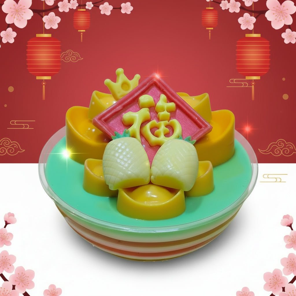 A radiant agar creation crowned with twin pineapples — symbols of wealth and good tidings — resting upon golden petal tiers and framed by a bold blessing plaque. The soft jade-toned surface contrasts beautifully with warm golden hues, creating a centrepiece that feels celebratory yet sophisticated.